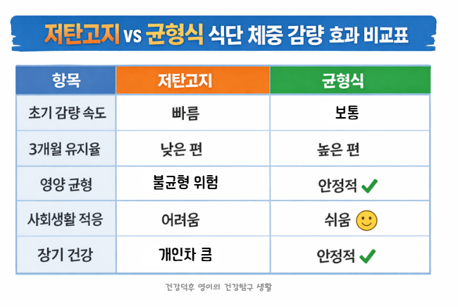저탄고지는 체중이 빠르게 줄어 성취감이 컸지만, 회식이 이어지자 바로 무너졌습니다. 반면 균형식은 감량 속도는 느렸지만 스트레스가 적어 6개월 이상 유지가 가능했습니다.