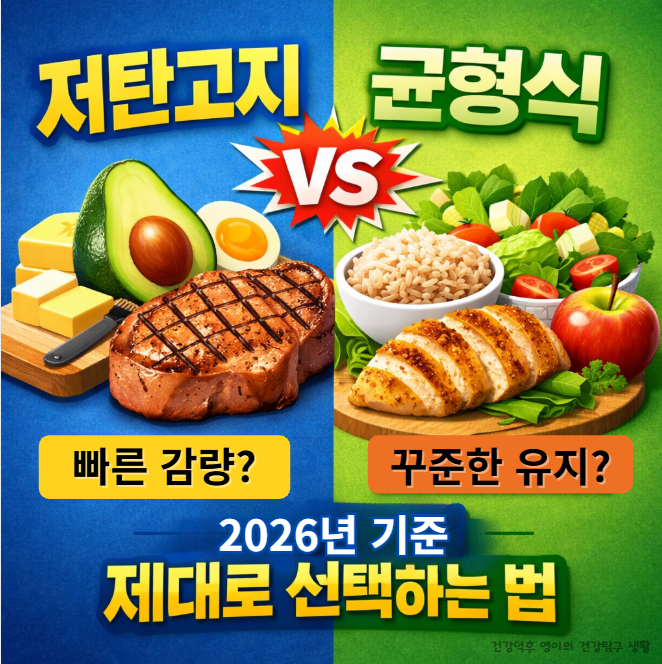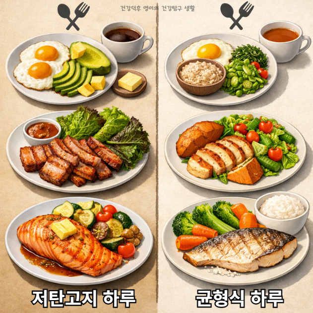 저탄고지 vs 균형식 식단, 어떤 다이어트가 2026년 기준 내 몸에 맞을까요? 체중 감량 효과, 유지 가능성, 부작용, 실제 식단 예시까지 비교해드립니다.