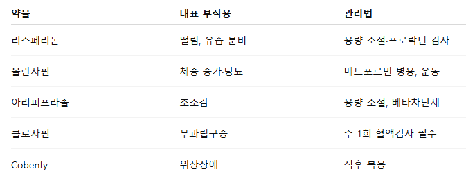 - 3세대 신약: 💊 Cobenfy (xanomeline-trospium) – 체중 증가 거의 없고 음성 증상 개선 (2025 도입 예정)