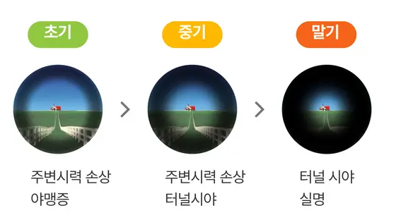 • 주변 시야가 좁아지고 중앙 시야만 남음.