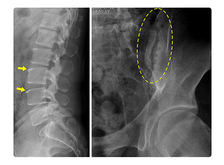 <척추의 밝은 모서리,천장관절의 골미란과 연골밑뼈의 경화>