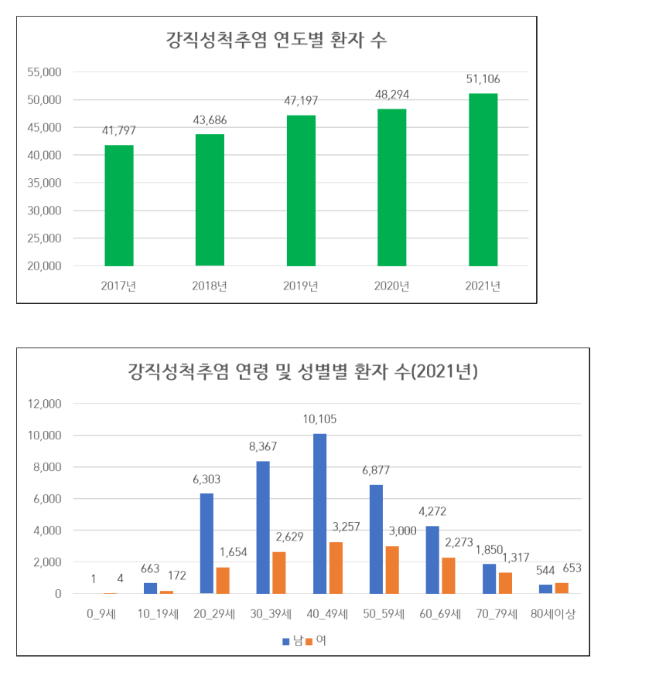 <연도별 강직성척추염 환자 수와 연령,성별별 환자수>