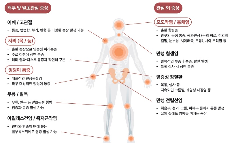 - 특징: 아침에 뻣뻣함, 장기간 지속되는 요통, 포도막염 동반 가능