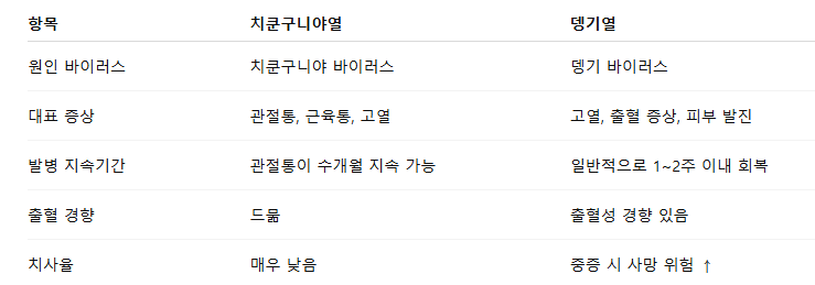치쿤구니야열은 뎅기열과 유사한 증상을 보이지만, 다음과 같은 명확한 차이가 있습니다: