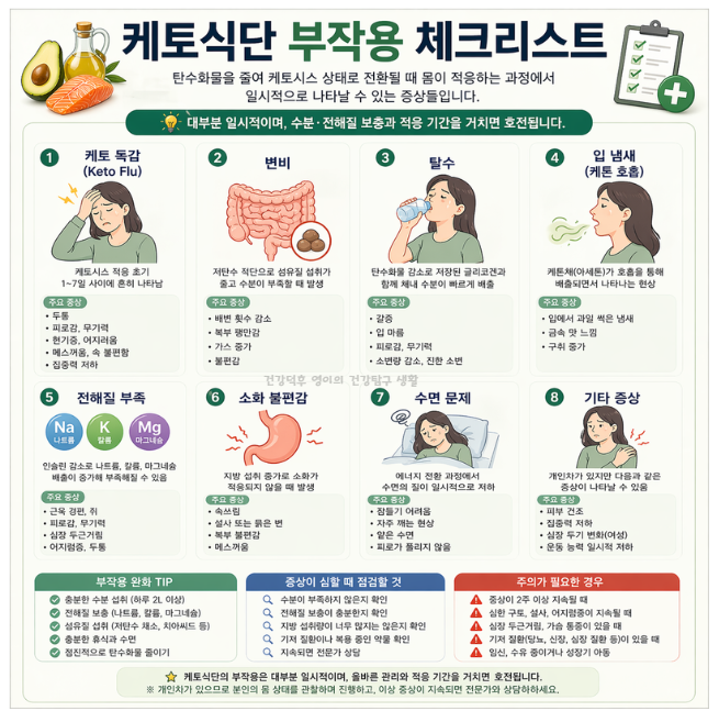 초기에 가장 많이 묻는 것이 케토 독감입니다. 이는 몸이 탄수화물 중심 대사에서 지방 중심 대사로 바뀌는 과정에서 나타나는 적응 반응으로 설명됩니다.