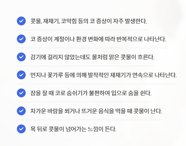- 맑거나 누런 콧물, 코막힘, 재채기, 후비루(목뒤로 콧물이 넘어감), 얼굴 통증/압박감(부비동염일 때) 등이 대표적이에요.