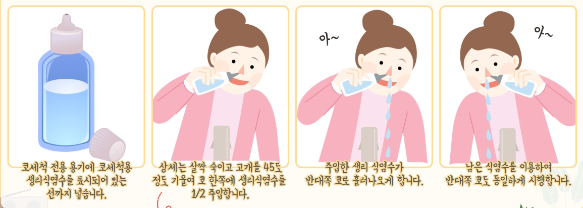 - 생리식염수 세척(멸균·증류·끓여 식힌 물만!)로 점액과 알레르겐을 씻어내기.