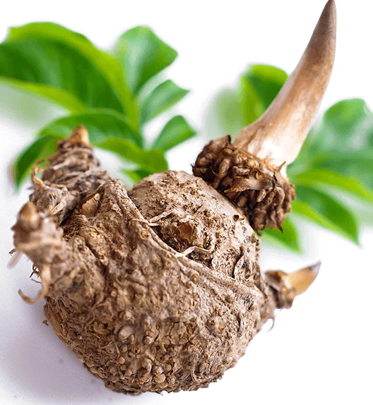 곤약은 천남성과(Araceae) 식물 Amorphophallus konjac의 뿌리(구근)를 가공해 만든 식품이에요.