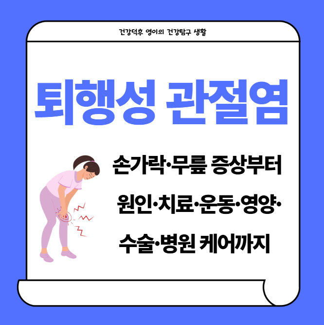 퇴행성 관절염의 증상, 원인(노화, 과사용, 유전), 손가락·무릎 영향, 치료법(운동·약·영양·수술), 병원 추천, 관절에 좋은 음식까지! 이해하기 쉬운 톤으로 풀었어요
