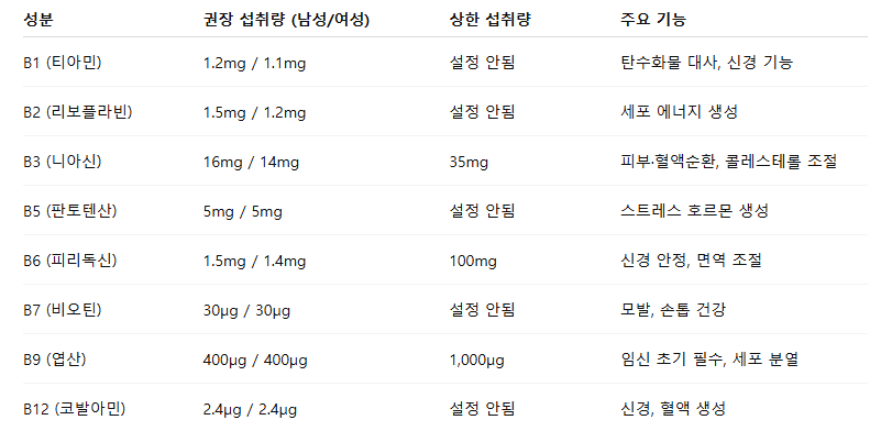 🔹 비타민B군 주요 성분별 권장량 (성인 기준)