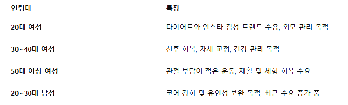 • 특히 산후 회복, 골반 교정 등 여성 특화 효과가 부각되며, 20~40대 여성층에서 빠르게 확산
