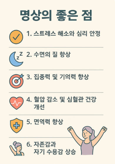 명상은 우리 몸의 염증 반응을 조절해서 면역 체계를 더 강하게 만들어줘요.