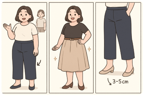 - A라인 스커트 or 와이드 팬츠: 허벅지 커버에 최고