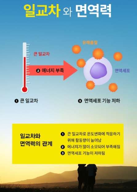 • 일교차·온도 변화: 아침저녁 온도 차가 크면 신체 항상성 조절이 힘들어지고, 면역세포가 스트레스를 받는다는 연구 있음.