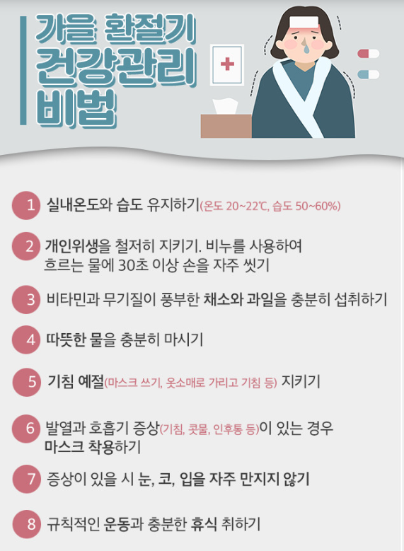• 환절기 피부·호흡기 관리: 보습제 바르기, 가습기 사용, 실내 먼지 청소 등.