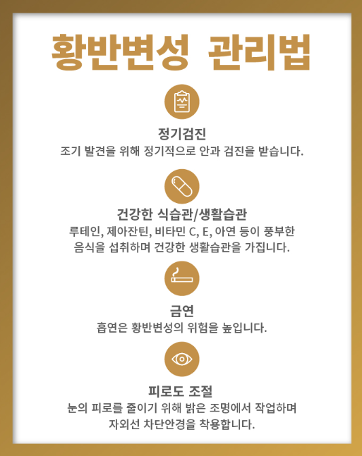 - 영양제(AREDS2)와 생활습관 관리로 진행 늦출 수 있음