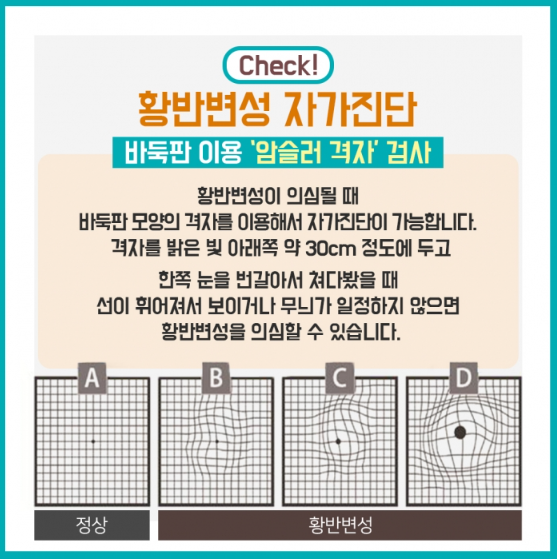이미지로 제공한 Amsler Grid 테스트를 활용해 정기적으로 자가 점검하시고,