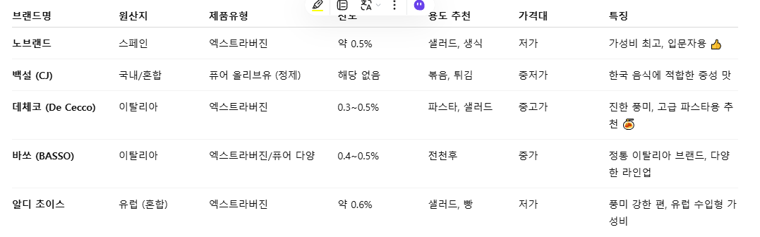 ✅ 올리브유 브랜드별 비교표 (2025년 기준)