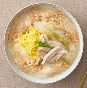 차갑게 식힌 닭육수에 겨자, 식초 등을 넣고 만든 시원한 국수 요리!