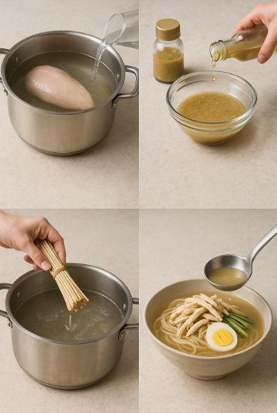 - 국수 위에 닭고기, 오이채, 달걀을 올리고 육수를 부으면 완성!