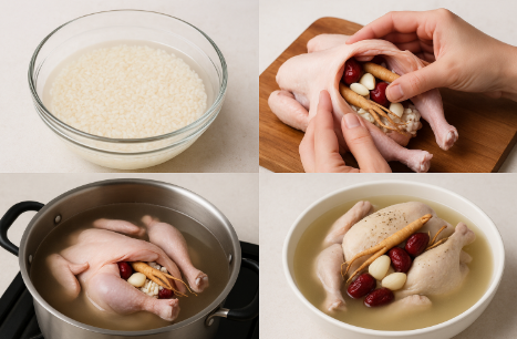 영계 2마리, 찹쌀 1컵, 인삼 2뿌리, 마늘 10쪽, 대추 4개, 물 2.5L