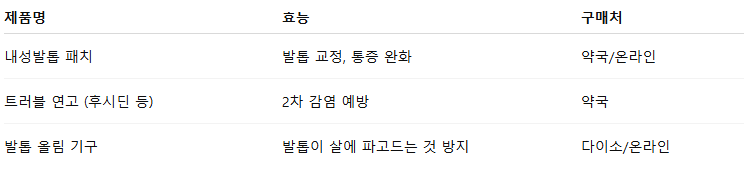 - 발톱 올리기 스프링 or 패드: 약국에서 구매 가능, 3~4일 간격으로 교체