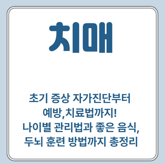 치매는 조기 진단이 핵심입니다. 치매 원인, 자가진단 체크리스트, 검사 방법, 발생 나이, 예방 습관, 치료법, 복용 약, 두뇌에 좋은 음식까지 친절하게 정리했어요.