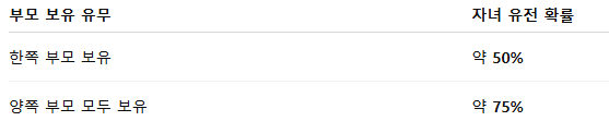 - 유전성 질환: 부모 중 한 명이 돌연변이를 보유하면 자녀에게 50% 확률로 유전