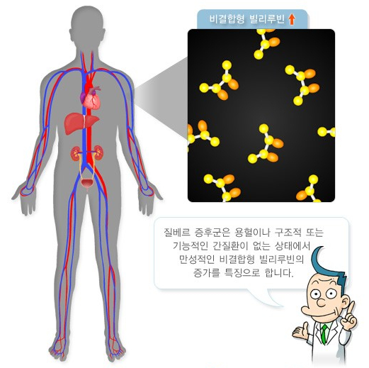 • 주요 원인: 간에서 빌리루빈을 처리하는 효소 UGT1A1의 기능 저하