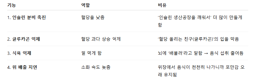 - 식욕 억제 + 혈당 조절 + 인슐린 민감도 향상
