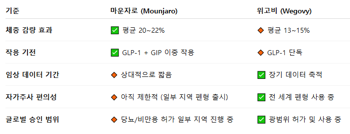 위고비는 자가주사 형태와 오랜 임상 데이터를 강점으로 내세울 수 있으나, 마운자로는 강력한 이중 작용 기전(GIP+GLP-1)을 바탕으로 향후 국내 비만 치료 시장에서 핵심 약물이 될 가능성이 높습니다.