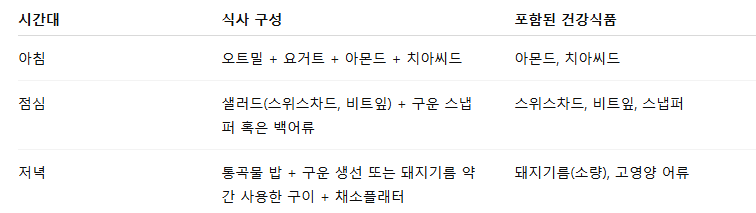 아래는 하루 식단에 위 식품들을 녹여내는 예시예요.